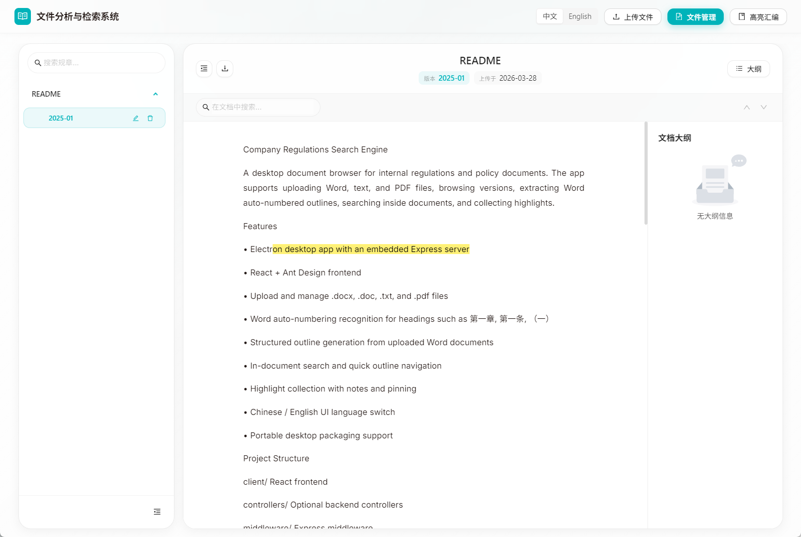 这是一个专门面向 规章制度类文档 的浏览、检索与大纲识别工具,重点解决“Word 文档结构化阅读”这件事。